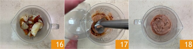 Nehmen Sie die im Ofen gebackenen Äpfel und geben Sie sie in ein Mixgefäß 16. Pürieren Sie mit dem Stabmixer, und falls nötig, fügen Sie etwas Wasser hinzu 17, etwa 20 g, bis ein homogenes Püree entsteht 18.