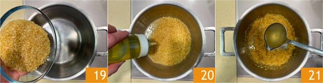 Geben Sie den Reis in einen Topf 19, fügen Sie das Öl hinzu 20 und rösten Sie ihn für einige Minuten. Ablöschen mit Gemüsebrühe 21 und garen, dabei jedes Mal eine Kelle Brühe nachgießen, sobald die vorherige vom Reis aufgenommen wurde.