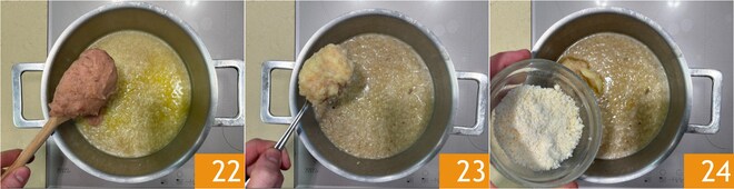 Eine Minute vor Ablauf der Garzeit das Apfelpüree 22, die saure Butter 23 und den Parmesan 24 hinzufügen. Schalten Sie die Hitze aus und rühren Sie alles cremig.