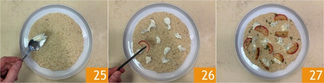 Lassen Sie den Risotto 1 Minute ruhen, dann richten Sie ihn an und fügen Gorgonzola-Flocken hinzu 25. Legen Sie die sautierten Äpfel darauf 26 und vollenden Sie mit einer Prise Thymian. Ihr Risotto mit Äpfeln und Gorgonzola ist servierfertig 27.