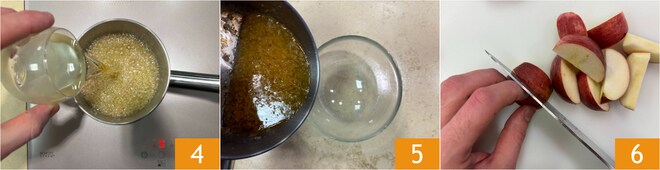Sobald die Schalotte zu brutzeln beginnt, mit Weißwein ablöschen 4 und 5 Minuten bei mittlerer Hitze kochen. Sobald sie fertig ist, in eine Schüssel umfüllen 5 und im Kühlschrank fest werden lassen, während Sie mit dem Rezept fortfahren. Nehmen Sie sich in der Zwischenzeit das Püree vor: Schneiden Sie 2 Äpfel in Spalten 6, entfernen Sie die Kerne und das Kerngehäuse.