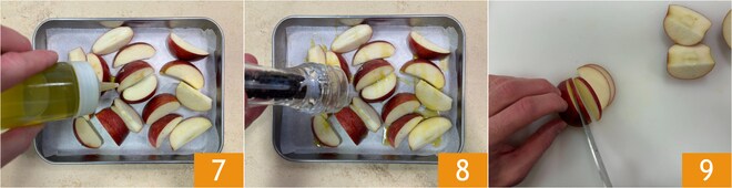 Legen Sie sie auf ein mit Backpapier ausgelegtes Backblech und würzen Sie mit Öl 7, Salz und Pfeffer 8. Backen Sie im vorgeheizten Umluftofen bei 200°C für 15 Minuten. Schneiden Sie in der Zwischenzeit einen Apfel in 2 mm dicke Scheiben 9.