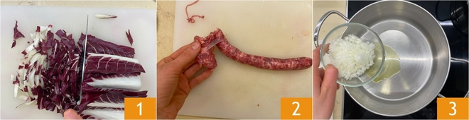 Um das Risotto mit Radicchio und Wurst zuzubereiten, schneiden Sie den Radicchio in Streifen 1, entfernen Sie die Hülle der Wurst und zerbröseln Sie sie 2. Geben Sie das native Olivenöl extra in einen Topf, fügen Sie die gehackte Zwiebel hinzu und lassen Sie sie bei schwacher Hitze weich werden 3.