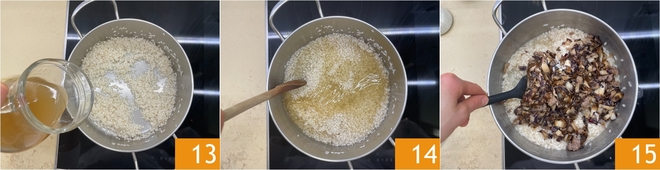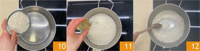 In einem Topf den Carnaroli-Reis hinzufügen und rösten 10. Wenn die Körner sehr heiß sind, mit Weißwein ablöschen 11. Lassen Sie den Alkohol bei mittelhoher Hitze verdunsten 12.