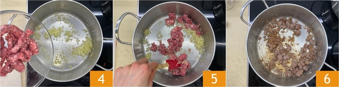 Nach etwa 3 Minuten fügen Sie die von der Hülle befreite Wurst hinzu 4. Halten Sie die Temperatur auf mittelhoch und rühren Sie häufig mit einem Spatel um 5. Kochen Sie weiter für etwa 7 Minuten oder bis sie gut gebräunt ist 6.