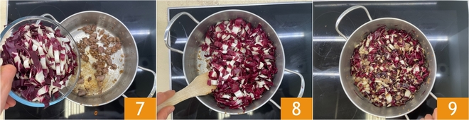 Sie können jetzt den geschnittenen Radicchio hinzufügen 7. Gut mit einem Löffel umrühren 8, weitere 3 Minuten kochen lassen und beiseite stellen 9.