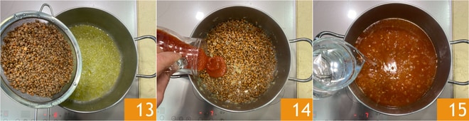 Fügen Sie die Linsen hinzu 13 und mischen Sie. Gießen Sie das Tomatenpüree 14 und das kalte Wasser 15 hinzu.
