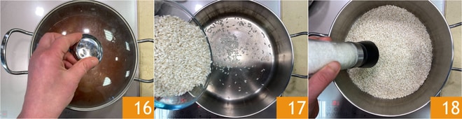 Bedecken Sie den Topf mit einem Deckel 16 und lassen Sie es 25 Minuten kochen. Geben Sie den Reis in einen anderen Topf 17 und rösten Sie ihn trocken für 3-4 Minuten. Salzen Sie nach Geschmack 18.