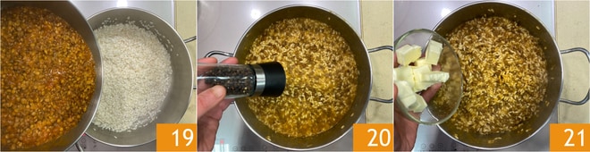 Fügen Sie die Linsen hinzu 19 und kochen Sie den Reis; geben Sie nach und nach heißes Wasser (oder Brühe) hinzu. Am Ende der Garzeit salzen und pfeffern Sie nach Geschmack 20. Schalten Sie das Feuer aus, fügen Sie die kalte Butter hinzu 21 und rühren Sie cremig.