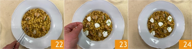 Richten Sie das Gericht an, legen Sie die marinierten Garnelen 22 und die Stracciatella auf die Oberfläche des Reises. Vervollständigen Sie mit dem Fenchel 23. Das Risotto mit roten Linsen und Garnelen ist bereit zum Genießen 24!