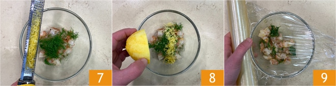 Duften Sie mit der abgeriebenen Zitronenschale 7 und dem Zitronensaft 8. Mischen Sie alles gut und bedecken Sie die Schüssel mit Frischhaltefolie 9. Lassen Sie es im Kühlschrank bis zur Verwendung marinieren.
