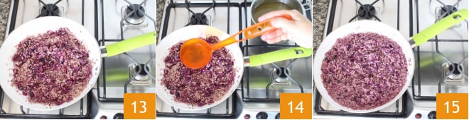 Beginnen Sie mit dem Kochen des Reises. Geben Sie ihn in die Pfanne mit dem Kohl 10 und rösten Sie ihn für 3 Minuten unter Rühren mit einem Kochlöffel 11. Dann gießen Sie den Rotwein hinzu 12