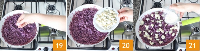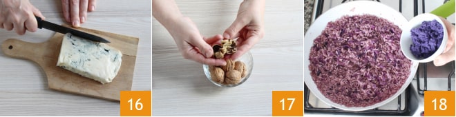 Bereiten Sie, wenn das Kochen fast beendet ist, den Rest der Zutaten vor. Entfernen Sie die Rinde vom Gorgonzola und schneiden Sie ihn in Stücke 16, dann schälen Sie die Walnüsse und erhalten 50 g Kerne 17. Gut, fügen Sie die Rotkohlcreme zum Risotto hinzu 18.