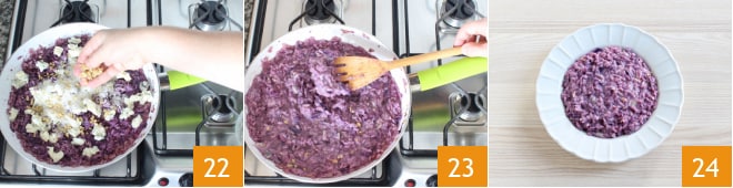 Zum Schluss die Walnusskerne 22 und rühren Sie alles gut um 23. Ihr Risotto mit Rotkohl und Gorgonzola ist servierfertig, guten Appetit 24.