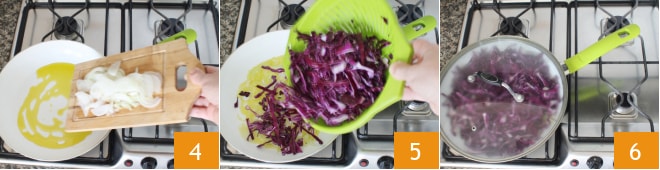 Um das Risotto mit Rotkohl und Gorgonzola zuzubereiten, beginnen Sie mit der Reinigung des Kohls. Entfernen Sie die äußeren Blätter und schneiden Sie ihn in dünne Scheiben, indem Sie den mittleren weißen und dicken Teil entfernen 1. Spülen Sie ihn unter einem kalten Wasserstrahl ab und lassen Sie ihn abtropfen 2. Dann schälen Sie die Zwiebel und schneiden Sie sie dünn 3.