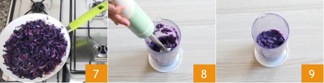 die Zeit, die nötig ist, um die Blätter weich zu machen 7. Übertragen Sie etwa 2/3 des Kohls in ein hohes schmales Gefäß 8 und pürieren Sie ihn mit einem Stabmixer, um eine Creme zu erhalten 9.