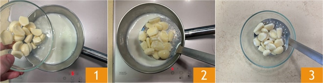 Um den Risotto mit Rübstiel, Sardellen und Knoblauchsauce zuzubereiten, schälen Sie zuerst die Knoblauchzehen. In einem kleinen Topf 150 g Milch gießen, den Knoblauch hinzufügen 1 und zum Kochen bringen. Mit einem Schaumlöffel abseihen 2 und den Knoblauch in eine kleine Schüssel geben 3. Die gekochte Milch entfernen und weitere 150 g Milch hinzufügen, den Vorgang noch dreimal wiederholen.