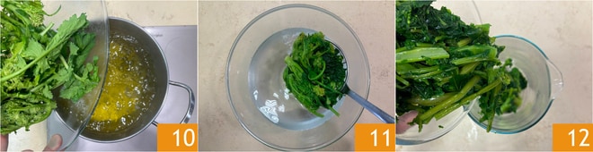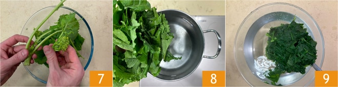 Den Rübstiel putzen, indem Sie die Spitzen von den Blättern trennen 7. Die Blätter einige Minuten in kochendem Salzwasser blanchieren 8, dann abseihen und in Eiswasser abkühlen 9.