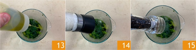 Das Öl hinzufügen 13, dann mit Salz und Pfeffer abschmecken 14 15.