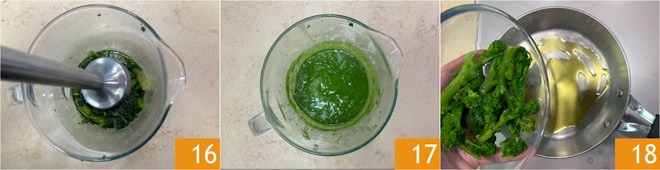 Pürieren 16, bis eine glatte und homogene Sauce entsteht 17. In einer Pfanne das Öl erhitzen und den Rübstiel hinzufügen 18.
