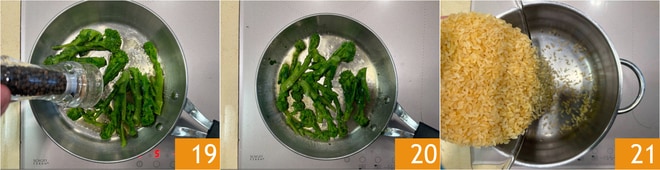 Mit Salz und Pfeffer abschmecken 19 und bei hoher Hitze einige Minuten anbraten 20. In einem Topf den Reis trocken rösten für einige Minuten 21.