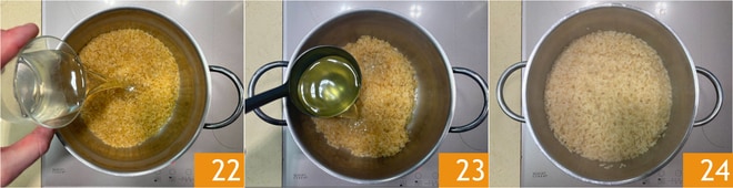 Mit Weißwein ablöschen 22 und den gesamten Alkohol verdampfen lassen, dann mit dem heißen Kochwasser 23 angießen, bis der Reis drei Finger hoch bedeckt ist; es werden ungefähr 1 Liter Flüssigkeit benötigt. Den Reis garen, dabei relativ trocken halten 24.