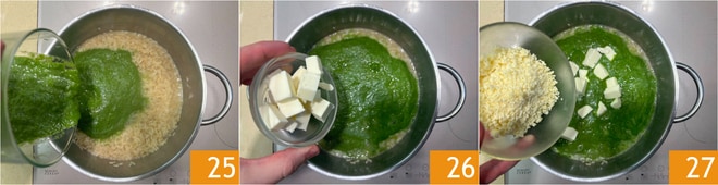 Den Herd ausschalten und die Rübstielsauce hinzufügen 25, dann mit kalten Butterstückchen 26 und Parmigiano Reggiano 27 cremig rühren.