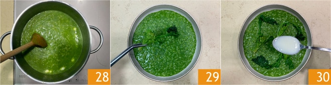Alles gut vermengen 28. Den Risotto anrichten, mit den ganzen Rübstielspitzen 29 und einem Löffel Knoblauchcreme garnieren 30.