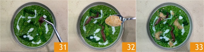 Mit 2-3 Sardellenfilets 31 und den zerbröselten Taralli 32 vollenden. Ihr Risotto mit Rübstiel, Sardellen und Knoblauchsauce ist servierfertig 33!