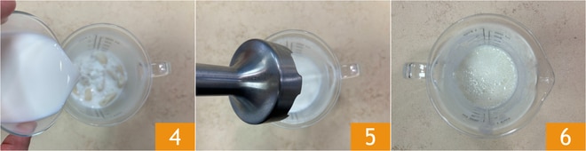 Am Ende dieses Prozesses die Knoblauchzehen in ein Gefäß geben zusammen mit 50 g Milch 4, dann pürieren 5, bis eine samtige Sauce entsteht 6. Mit Frischhaltefolie abdecken und bis zur Verwendung im Kühlschrank aufbewahren.