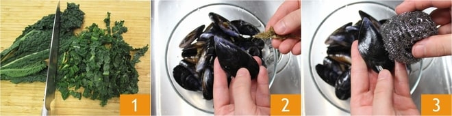 Um den Risotto mit Schwarzkohl und Miesmuscheln zuzubereiten, schneiden Sie zuerst den Schwarzkohl in Streifen und entfernen die härteren Stiele 1. Fahren Sie mit der Wie man Miesmuscheln reinigt und öffnet fort: Verwerfen Sie zunächst die zerbrochenen oder geöffneten, dann entfernen Sie die Ablagerungen mit einem Messer, ziehen den Bart ab 2 und schrubben die Schale mit einem Stahlschwamm 3.