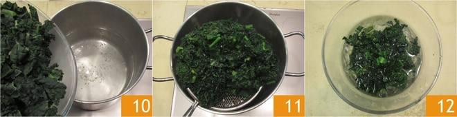 In der Zwischenzeit bringen Sie einen Topf mit Wasser zum Kochen und blanchieren den Schwarzkohl etwa 5 Minuten lang 10. Gießen Sie ihn ab, ohne das Kochwasser wegzuwerfen (halten Sie es warm, es wird benötigt, um den Risotto zu kochen) 11 und geben Sie ihn in eine Schüssel mit Eiswasser, um die Farbe lebendig zu halten 12.