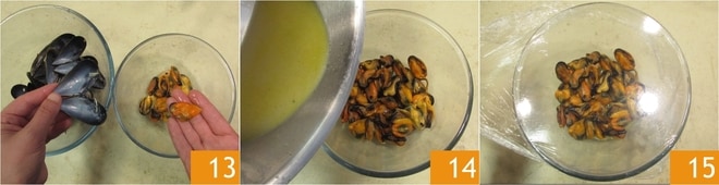 Schälen Sie die Miesmuscheln 13. Legen Sie die Muscheln in eine Schüssel zusammen mit einem Teil ihrer Kochflüssigkeit 14; die restliche Flüssigkeit wird benötigt, um den Reis zu kochen. Decken Sie sie mit Frischhaltefolie ab und stellen Sie sie beiseite 15.