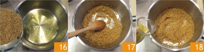 Nun können Sie mit der Zubereitung des Risottos beginnen: Rösten Sie den Vollkornreis in einem Topf mit einem Schuss Öl für 4-5 Minuten 16, häufig umrühren 17. Löschen Sie mit der beiseite gestellten Flüssigkeit der Miesmuscheln ab 18.