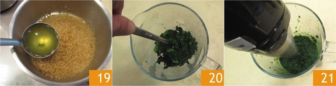 Kochen Sie den Reis, indem Sie nach und nach die heiße Schwarzkohlbrühe hinzufügen 19. In der Zwischenzeit gießen Sie den Schwarzkohl ab und geben ihn in einen Becher 20, dann pürieren Sie ihn mit einem Stabmixer, um eine Creme zu erhalten 21.