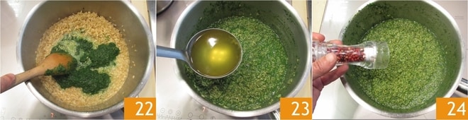 Wenn noch 5 Minuten bis zur Kochzeit des Reises fehlen, fügen Sie die Schwarzkohlcreme hinzu 22. Gut umrühren und den Risotto fertig kochen, bei Bedarf mehr Brühe hinzufügen 23. Sobald er fertig ist, mit rosa Pfeffer würzen 24.
