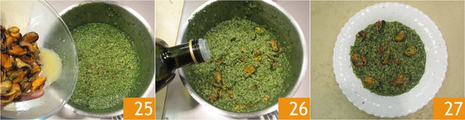 Fügen Sie die Miesmuscheln hinzu 25 und rühren Sie vorsichtig um, dann schalten Sie die Hitze aus und rühren Sie mit einem Schuss rohem Öl um 26. Ihr Risotto mit Schwarzkohl und Miesmuscheln ist servierbereit 27!