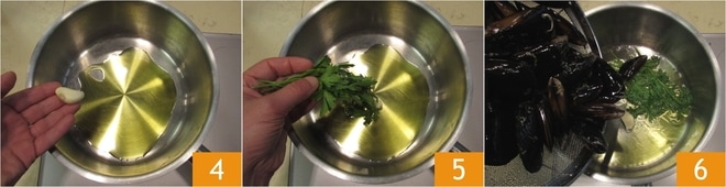 Erhitzen Sie in einem großen Topf das Öl mit dem Knoblauch 4, lassen Sie ein schönes Büschel Petersilie anbraten 5. Geben Sie dann auch die Miesmuscheln hinzu 6.