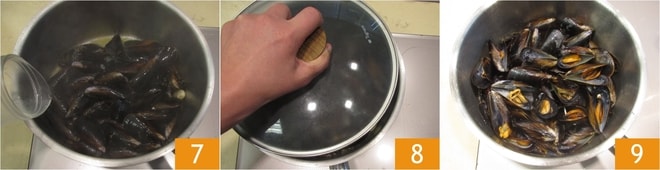 Löschen Sie mit dem Weißwein ab 7, decken Sie mit dem Deckel ab 8 und kochen Sie bei starker Hitze für 4-5 Minuten, wobei Sie den Topf gelegentlich schütteln. Wenn alle Miesmuscheln geöffnet sind, schalten Sie die Hitze aus und lassen Sie sie abkühlen 9. Entfernen Sie das Petersilienbüschel.