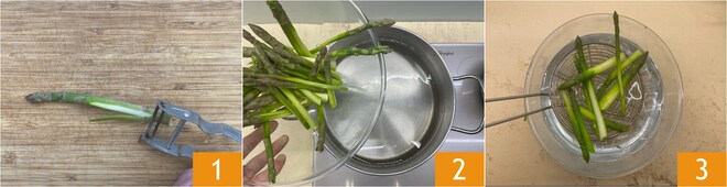 Um das Risotto mit Spargelcreme und Eigelbbröseln zuzubereiten, reinigen Sie den Spargel: Entfernen Sie die härtere Basis und schälen Sie den Stiel 1, blanchieren Sie den Spargel für 5 Minuten 2, dann abgießen und in Eiswasser tauchen, um die Farbe zu bewahren und das Garen zu stoppen 3.