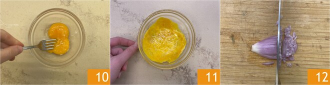 Schlagen Sie die Eigelb mit dem Salz 10 in einer Schüssel, bedecken Sie sie mit Frischhaltefolie und kochen Sie sie für eine Minute bei maximaler Leistung in der Mikrowelle, die Konsistenz sollte schwammig sein 11. Putzen und hacken Sie die Schalotte 12.