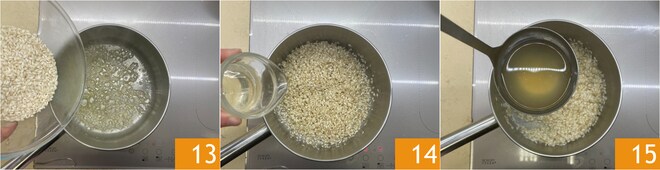 Dünsten Sie die gehackte Schalotte mit einem Stück Butter in einem Topf, fügen Sie den Reis hinzu 13, salzen Sie und rösten Sie, löschen Sie mit dem Weißwein ab 14, lassen Sie ihn verdampfen und setzen Sie das Kochen mit der Gemüsebrühe fort 15.