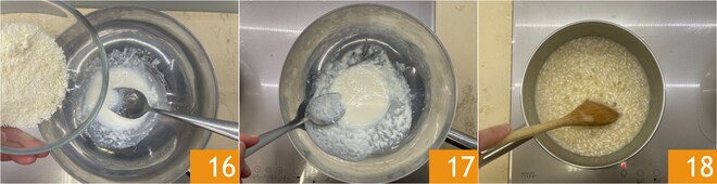Schmelzen Sie im Wasserbad (auch über der Brühe) den Parmigiano Reggiano DOP mit der Milch 16, rühren Sie, um eine glatte Soße zu erhalten 17. Wenn noch 2-3 Minuten bis zum Ende der Risotto-Kochzeit fehlen, geben Sie die Spargelcreme hinzu.