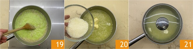 Rühren Sie um 19 und mischen Sie mit Parmigiano Reggiano DOP und Butter 20. Decken Sie mit einem Deckel 21 ab und lassen Sie es einige Sekunden ruhen, dann schlagen Sie es wellenartig.