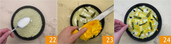 Servieren Sie das Risotto auf einem flachen Teller, garnieren Sie mit dem Parmigiano Reggiano DOP-Fondue 22, den Spargelspitzen, dem geriebenen Eigelb 23 und den essbaren Blumen 24.