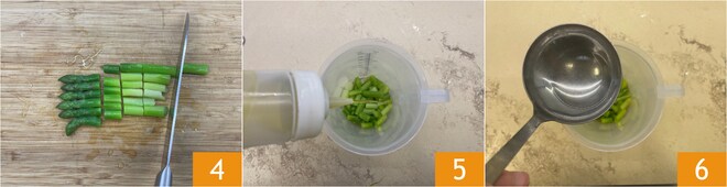 Trennen Sie die Spitzen und legen Sie sie beiseite, schneiden Sie den Rest in Stücke 4, geben Sie sie dann in ein hohes Gefäß mit einem Schuss Öl 5 und einer kleinen Schöpfkelle Kochwasser 6.