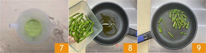 Pürieren Sie mit dem Stabmixer, bis eine homogene Creme entsteht 7. Erhitzen Sie einen Schuss Öl in einer Pfanne, geben Sie die Spargelspitzen hinzu 8, würzen Sie mit Pfeffer und Salz und braten Sie sie in der Pfanne, bis sie goldbraun sind 9, sie sollten bissfest sein.