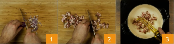 Um das Risotto mit Speck und Erbsencreme vorzubereiten, beginnt damit, den Topf mit der Gemüsebrühe auf den Herd zu stellen, die heiß zum Kochen des Reises benötigt wird. Setzt fort, indem ihr die Zwiebel fein putzt und hackt 1. Schneidet dann den Speck in Streifen 2 und begebt euch zum Herd. Gebt den Speck in einen Topf und fügt einen Schuss Öl hinzu 3.