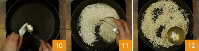 In einem Topf lasst 20 g Butter schmelzen 10 und fügt sofort den Reis hinzu 11: Um ihn zu rösten, reicht es aus, ihn einige Minuten lang oft umzurühren, bis die Körner gut warm und leicht aufgehellt sind. Der nächste Schritt besteht darin, den Reis ab und zu mit der heißen Brühe zu begießen, achtet darauf, dass er eine Handbreit über dem Reis bedeckt ist und rührt gelegentlich um 12.