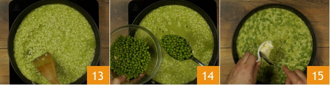 Wenn nur noch wenige Minuten bis zum Ende der Garzeit fehlen, gießt die Erbsencreme 13 und dann den restlichen Teil der ganzen Erbsen hinzu 14; vollendet die Garzeit. Schaltet die Hitze aus und fügt 20 g Butter hinzu 15.
